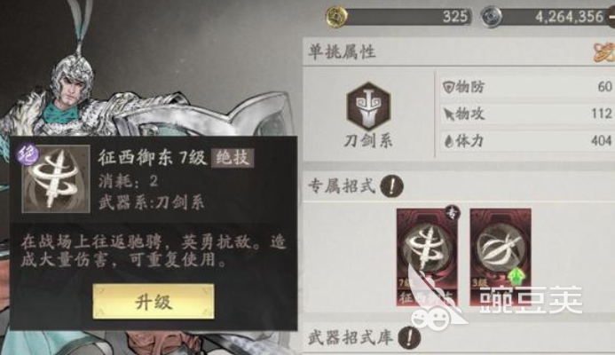 陳到的大招可以拼過很多的小招,一般都是從第二個回合開始他的強度就上來了,如果大家用陳到來過張遼的話,那么他的出招基本都會被整套的大招給拼掉,不管張遼是使用斗胸刀還是使用圈馬刀,這里的陳到其實都是可以拼過他的一些小招式的,那么這里陳到其實后期用的話,大家可以利用全配被動來打很多的效果,所以在單挑挑戰里面真的可以說是一個不亞于趙云的武將,他在天賦效果上面有一個征西御東的技能,這個技能是屬于一個刀劍系的技能。