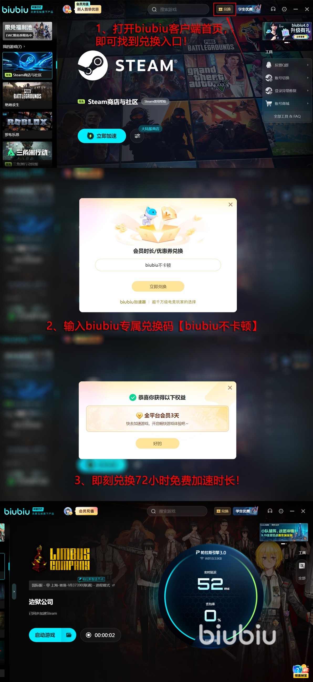 重點來了!不管是老玩家還是新用戶,現在輸入兌換碼【biubiu不卡頓】,直接領3天免費加速時長。首次注冊還能再得24小時,新人加起來整整96小時免費玩。